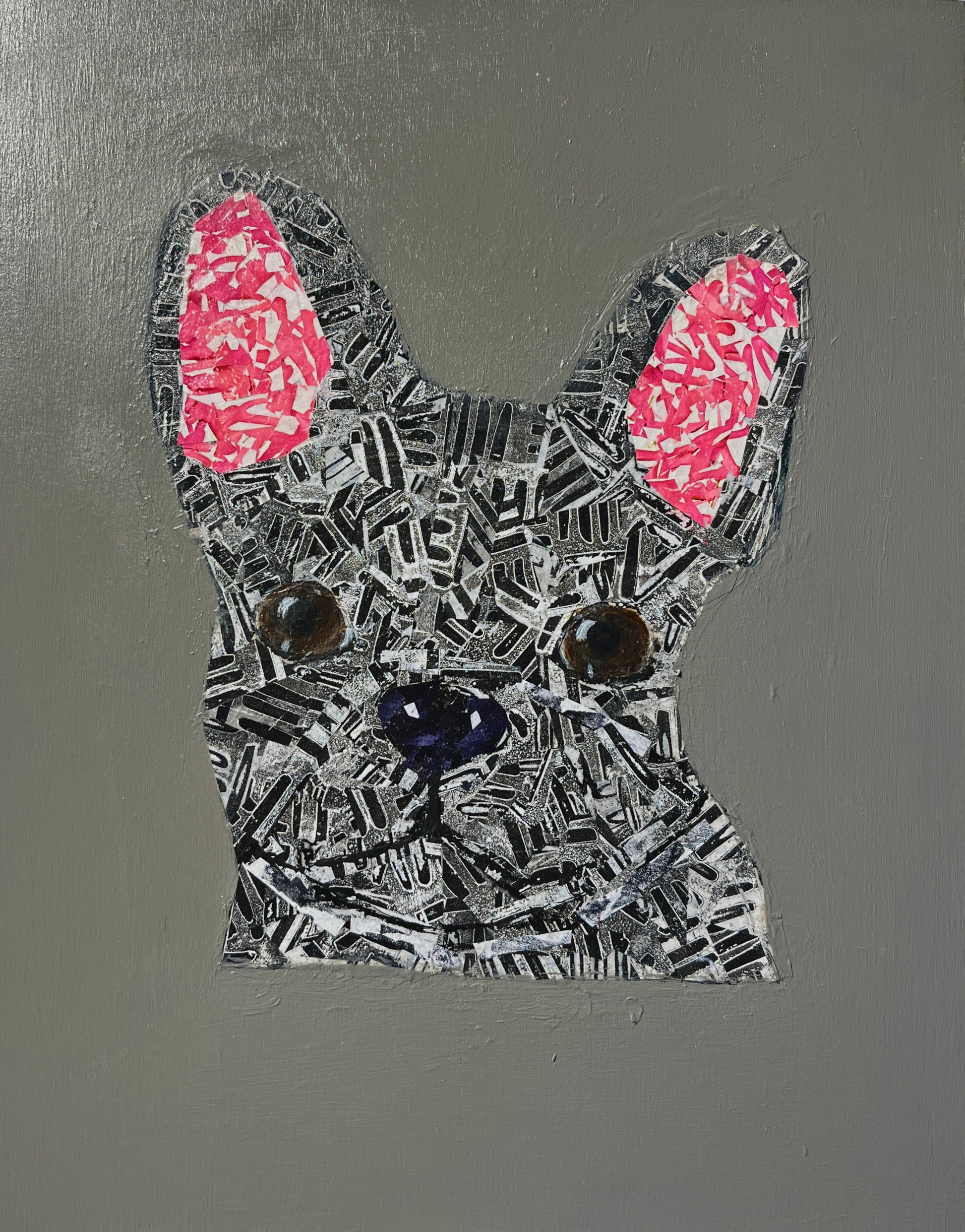Mixed Media Collage (gelli prints) on 8x10x1.5 cradle board. Eyes painted with acrylic paint Background and sides painted a neutral gray with acrylic.